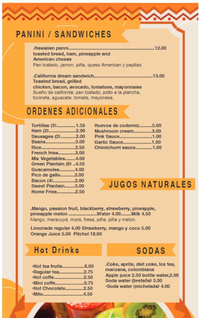 Mango, Passion Fruit, Blackberry, Strawberry, Pineapple, Soursop, Guava // Mango, Maracuya, Mora, Fresa, Pina, Guanabana, Guayaba.