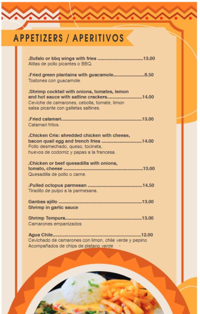 Shrimp, onions, tomatoes, and hot sauce. Served with lime and saltines or tostones // Ceviche de Camarones: Camaron, cebolla, tomate, y salsa picante. Con limón y galletas saltines o tostones