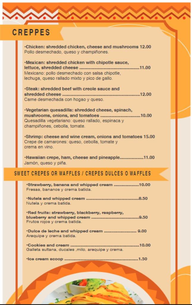 Shrimp, cheese, wine cream, onions, and tomatoes // Camarones: queso, cebolla, tomate y crema en vino